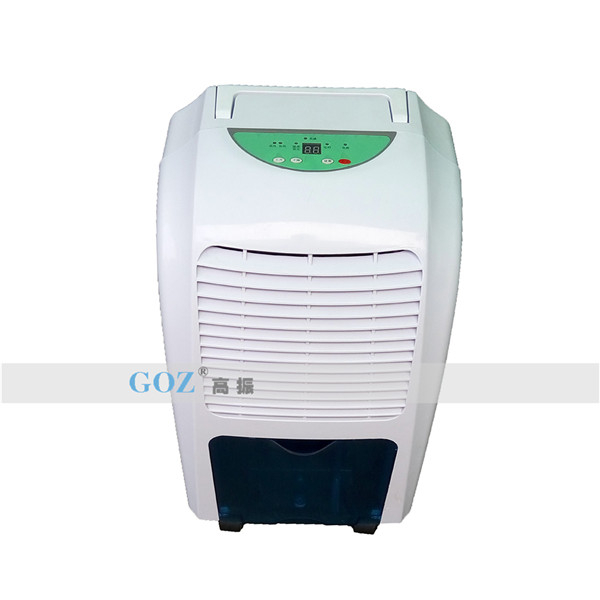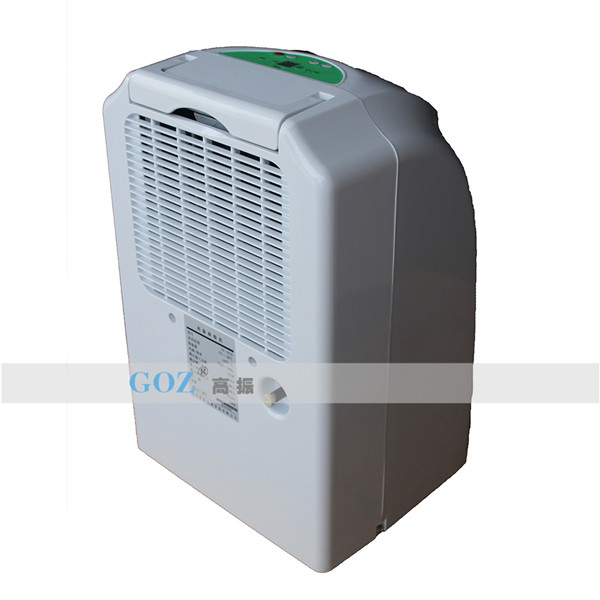 高振商用除濕機(jī)通過(guò)風(fēng)機(jī)將潮濕空氣抽入機(jī)器內(nèi)部,通過(guò)壓縮機(jī)制冷將蒸發(fā)器降溫至露點(diǎn)以下,潮濕空氣經(jīng)過(guò)蒸發(fā)器在表面凝結(jié)成水,匯集至接水盤后,流入水箱中,干爽空氣經(jīng)冷凝器重新加熱由出風(fēng)口排出,這樣不斷循環(huán)將室內(nèi)濕度降低。