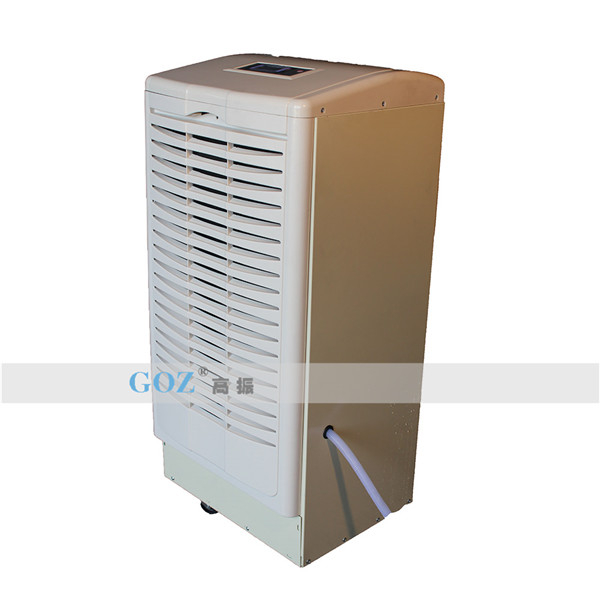 高振商用除濕機通過風(fēng)機將潮濕空氣抽入機器內(nèi)部,通過壓縮機制冷將蒸發(fā)器降溫至露點以下,潮濕空氣經(jīng)過蒸發(fā)器在表面凝結(jié)成水,匯集至接水盤后,流入水箱中,干爽空氣經(jīng)冷凝器重新加熱由出風(fēng)口排出,這樣不斷循環(huán)將室內(nèi)濕度降低。