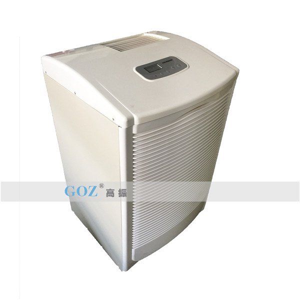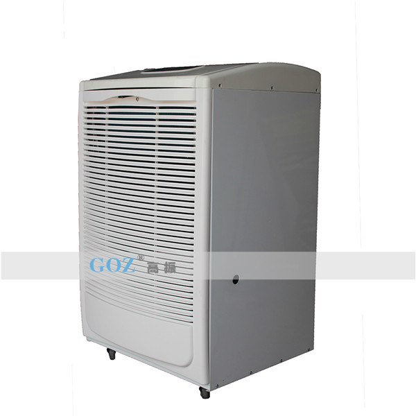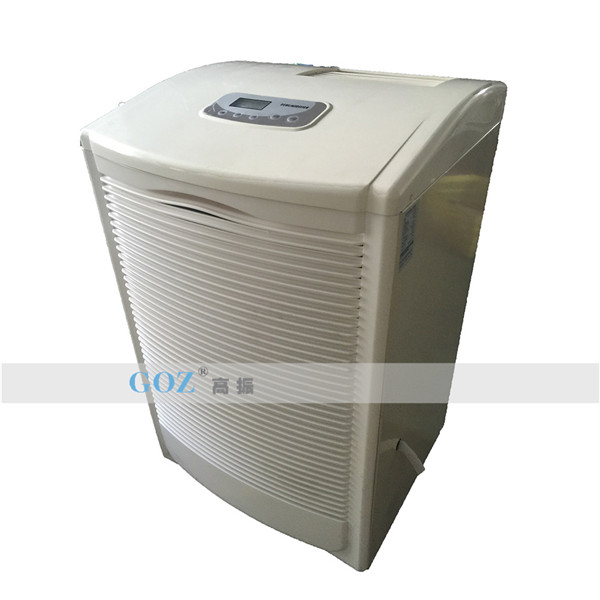 高振商用除濕機(jī)通過風(fēng)機(jī)將潮濕空氣抽入機(jī)器內(nèi)部,通過壓縮機(jī)制冷將蒸發(fā)器降溫至露點以下,潮濕空氣經(jīng)過蒸發(fā)器在表面凝結(jié)成水,匯集至接水盤后,流入水箱中,干爽空氣經(jīng)冷凝器重新加熱由出風(fēng)口排出,這樣不斷循環(huán)將室內(nèi)濕度降低。