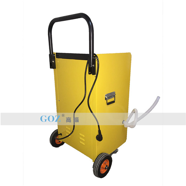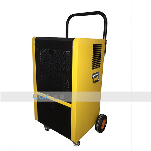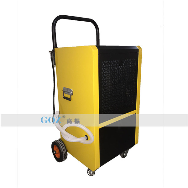 高振手推車除濕機通過風機將潮濕空氣抽入機器內部,通過壓縮機制冷將蒸發(fā)器降溫至露點以下,潮濕空氣經(jīng)過蒸發(fā)器在表面凝結成水,匯集至接水盤后,流入水箱中,干爽空氣經(jīng)冷凝器重新加熱由出風口排出,這樣不斷循環(huán)將室內濕度降低。